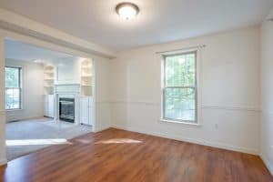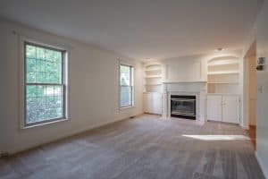 The kitchen and dining areas feature LVP flooring while the living room and bedrooms are carpeted. There is a Cozy living room with gas fireplace and built-in cabinetry.