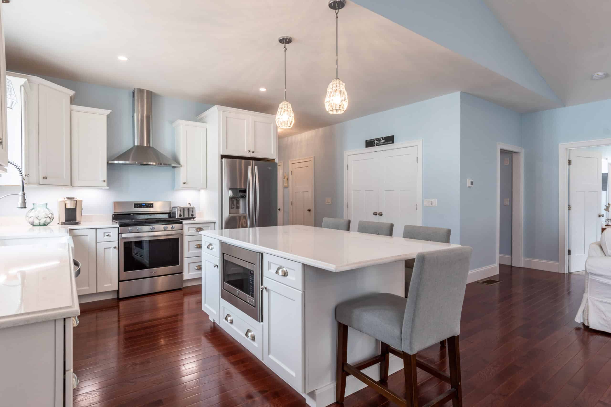 This particular home is loaded with CUSTOM upgrades and features two bonus rooms that were not on the original plans. The flooring is a gorgeous Brazilian cherry which compliments the light and bright details of the home including white cabinets, vanities, and quartz countertops as well as custom high-end crystal light fixtures throughout the home. The kitchen has a large center island that has seating & storage, all upgraded appliances, large pantry closet (custom upgrade!) and an elegant farmer’s sink.